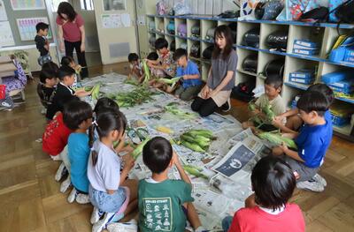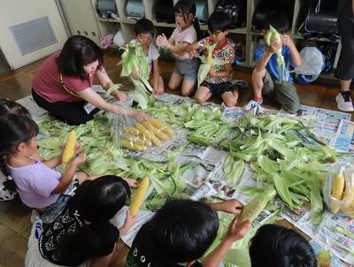 1年生が朝の時間にとうもこしの皮むきを行いました。